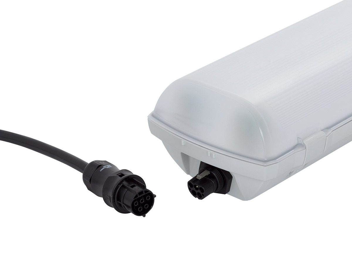 One-row plastic industrial LED light fitting with motion detector, with diffuser made of translucent polycarbonate.