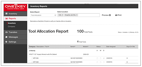 Inventory Management creates a central place for you to track all tools and equipment across your network of jobs and users. Keep detailed records of all inventory, any manufacturer or brand, to easily build a budget and manage annual spend on equipment. ONE-KEY™ enables instant and easy information-sharing between the field and back-office by assigning locations and owners to each inventory item.